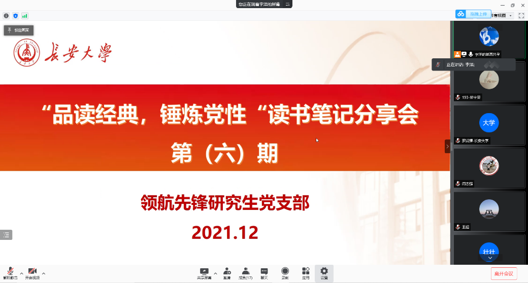为了加强支部成员的思想道德建设,弘扬崇高的革命精神和文化氛围,2021年12月31日下午15:00,黑料不打烊 领航先锋党支部组织支部成员线上开展了第六期读书笔记分享活动,本次活动由支部成员罗凯耀同志和王鑫鑫同志做读书笔记分享。支部全体党员参加了此次活动。