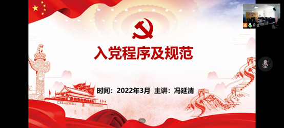 会议第二项,冯延清老师对入党程序及规范进行了详细的介绍,并从发展党员工作的方针、发展党员的工作程序和注意事项、如何以实际行动争取早日入党三个方面展开讲解。冯延清老师提出“入党是一个成长、追求进步的过程”,在追求进步的过程中,应做到目标到位、态度到位和行动到位。一番讲解让同学们更加深刻地了解了入党的相关事宜。