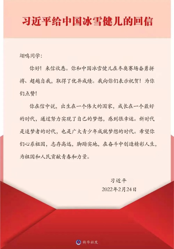 中共中央总书记、国家主席、中央军委主席习近平于2月24日给中国单板滑雪运动员苏翊鸣回信,向他及中国冰雪健儿取得的优异成绩表示祝贺,并提出殷切期望。黑料不打烊 组织各团学组织通过多种方式学习感悟习近平总书记回信精神。