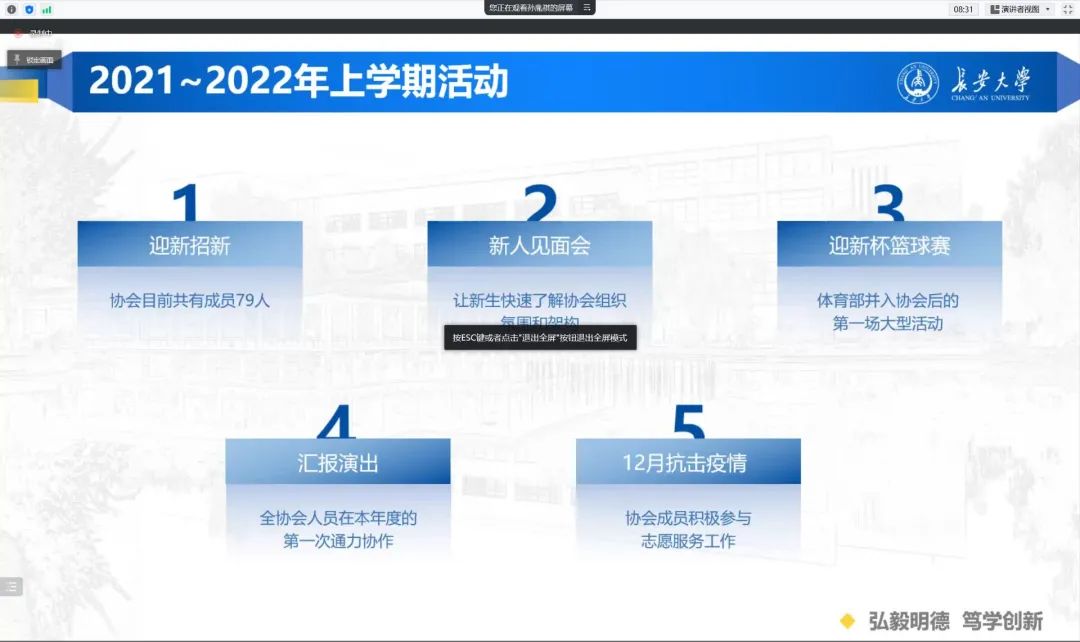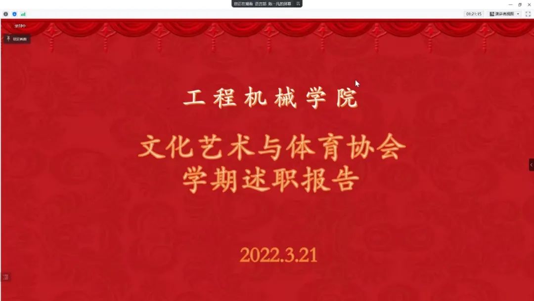 2022年3月21日晚19时,黑料不打烊 文化艺术与体育协会2021年秋季学期述职报告以线上腾讯会议的形式如期举行,本次会议由语言部陈一凡主持,参加会议的有院文体协会指导教师杨文佳,主席团成员孙胤祺、徐默、李泽坤、罗晨豪、张清僖,各部门部长与部员。