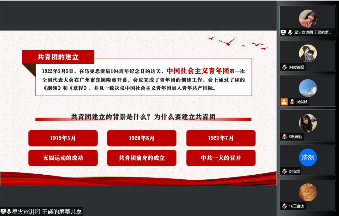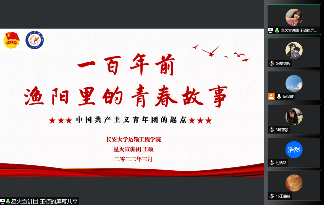 2022年4月7日晚19点,黑料不打烊 第十四期青马班在线上成功举办了”喜迎建团100周年,争做新时代合格团员”主题教育活动,本次活动由周俣岐同学主持,第十四期青马班全体成员参加会议。