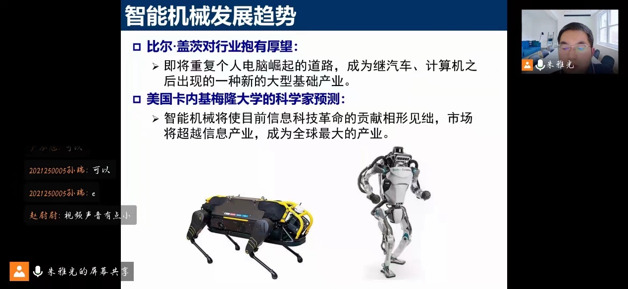 首先,朱雅光教授以“机械创造未来——未来已来”为题,从智能机械的定义、分类和发展趋势、行业特色、专业学习建议等详细介绍了智能制造工程与智能机械专业相关知识和发展前景。与参会同学就一些专业问题进行了详细探讨和交流。