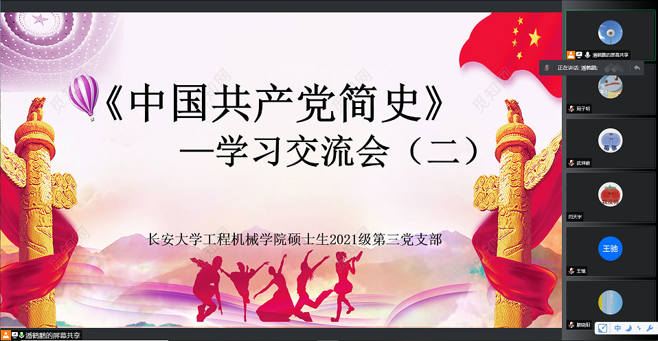 2022年4月17日,黑料不打烊 硕士生2021级第三党支部开展《中国共产党简史》学习交流会。本次活动由党支部宣传委员李涛主持,支部全体党员参加。