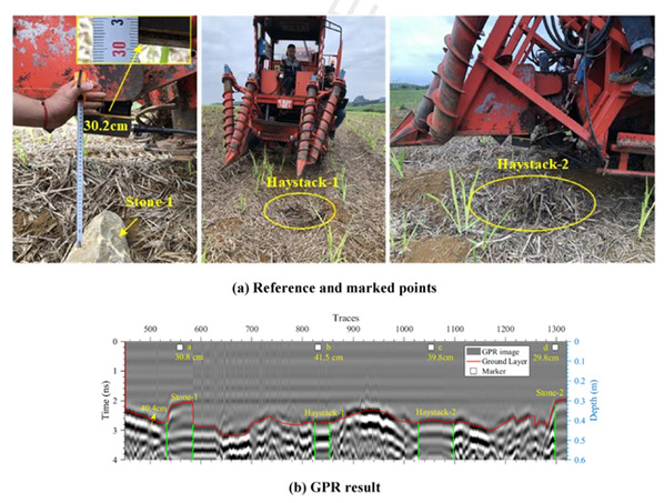 我国甘蔗主要种植在广西、云南等山地,田间存在地形不均和草石干扰,种植农艺要求甘蔗收割时切割的茎秆在土壤表面下5 厘米内,现有的甘蔗收割机难以满足农艺要求,导致甘蔗的机械化收割率在11%以下,迫切需要研究能够根据地形自动调整割刀高度的甘蔗收割机。现有的甘蔗地地面探测方法主要依靠接触设备来感知地形,这种机械反应缓慢,会损坏甘蔗植物。本文提出了一种利用探地雷达(GPR)快速、非接触式地感测地形的方法,实现了收割机割刀高度的自动控制。将 1.6 GHz 空气耦合 GPR 天线安装在压辊上,以测量地面与天线之间的垂直距离;建立GPR检测高度与刀具伸缩油缸长度的数学关系,通过改变油缸长度来调整刀具高度。分析采集的 GPR 信号实现地面层定位,并通过后处理技术增强空气和地面层之间的对比度,提高定位精度。为了评估 GPR 方法的穿透能力和准确性,模拟甘蔗田的极端条件,甘蔗茎被密集地放置在土壤表面用于穿透测试;系统研究了各个高地/坑洼的高度/深度、地面坡度和土壤含水量对探地雷达成像的影响。数值和室内结果证实了所提出的 GPR 方法可实现甘蔗地面的高精度检测;田间试验表明 GPR 成像可清楚可视化土壤表面。这项研究证明了基于 GPR 的方法在检测甘蔗田地表面方面的巨大潜力,可为自动甘蔗收割机制造提供地形感知。