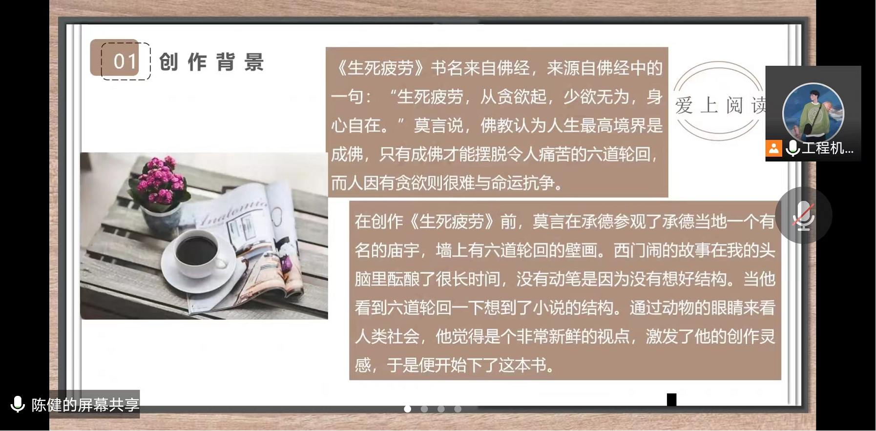 陈健分享了莫言的代表作之一《生死疲劳》。在这本书中,莫言以寓言的方式观照历史、借荒诞的想象书写现实,从而讲述一个农民家族半个多世纪以来悲欢离合、兴衰演变的长篇巨著。在小说中,被冤杀的地主西门闹经历了六道轮回,变成驴、牛、猪、狗、猴,最终又转世为一个大头婴儿,滔滔不绝地讲述着自己每一世的离奇经历。小说通过六道轮回的想象跨越生与死,悲悯着历史变迁之中无常的命运,也歌颂着生存于这片土地上的农民们世代相继、生生不息的执著生命力。