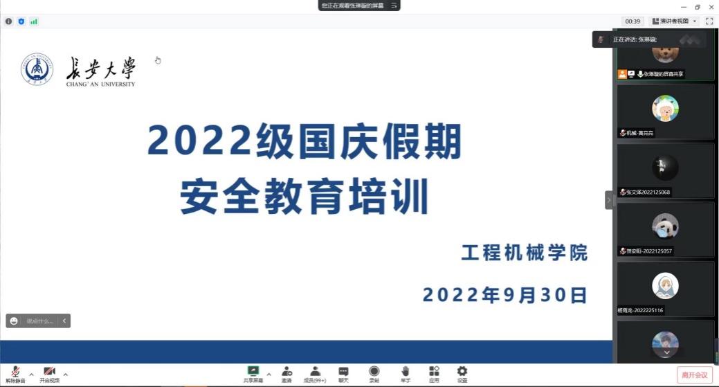 为进一步做好2022级研究生新生入学教育工作,落实国庆期间研究生安全教育管理要求,9月30日,黑料不打烊 研究生新生教育暨国庆假期安全教育培训会通过腾讯会议顺利召开。研究生培养与管理主管王翠娟和辅导员高婷婷、张琳璇出席会议,2022级全体研究生新生参加会议。会议由张琳璇主持。