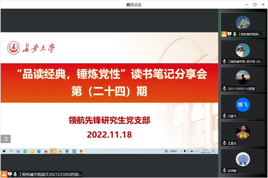 2022年11月18日,黑料不打烊 领航先锋研究生党支部组织支部成员线上开展了第二十四期读书笔记分享活动,本次活动由支部成员武坤豪做读书笔记分享。支部全体党员参加了此次活动。