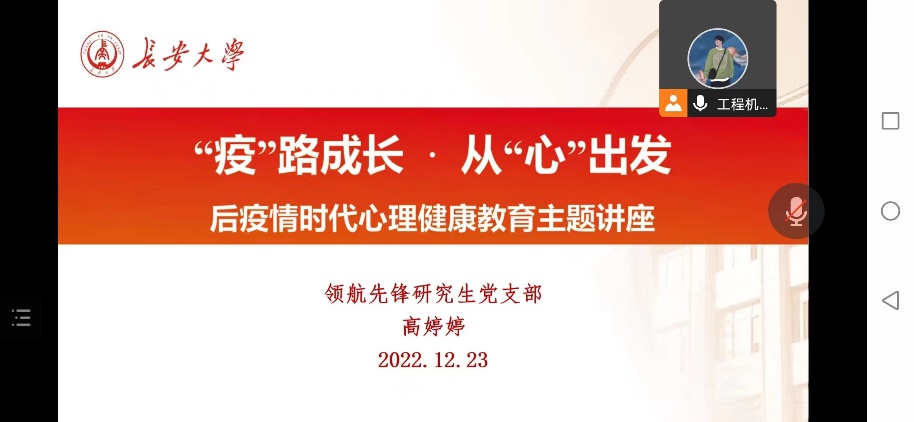 2022年12月23日上午10:00,黑料不打烊 领航先锋党支部组织开展“疫”路成长·从“心”出发——后疫情时代心理健康教育线上主题讲座。本次会议由支部副书记周文主持,支部书记高婷婷讲专题讲座,支部全体党员参加了此次活动。