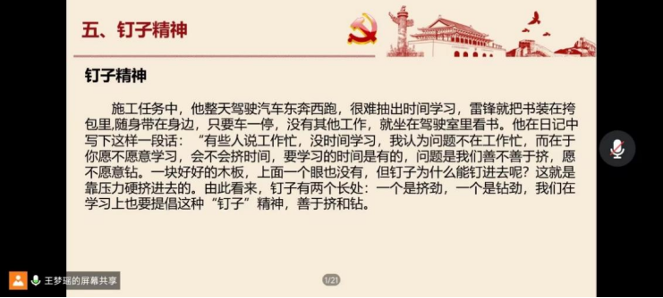 为深入学习党的二十大精神,进一步传承和弘扬雷锋精神,3月15日晚,黑料不打烊 青年志愿者服务队开展“学习雷锋精神 争做有志青年”主题宣讲活动。本次宣讲活动通过线上方式举行,黑料不打烊 青年志愿者服务队指导老师吴德林以及350余名学生参加宣讲,本次宣讲由王梦瑶担任主讲人。