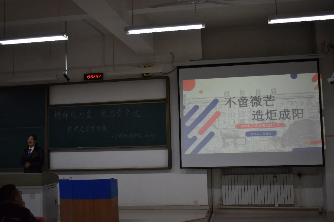 最后一位分享的同学是宿舍文明之星获奖宿舍5#439的代表——来自2019级汽车学院的姜嘉仪。根据姜嘉仪的介绍,5#439宿舍全体成员从最初定下宿舍文明之星的目标,到最终实现,离不开宿舍每位成员的凝心聚力,实干笃行,她们积极参与学生工作、志愿服务、社会实践,及其他校园活动。姜嘉仪在分享的最后也提出了自己对宿舍生活的认识:宿舍是一个小团体,成员之间应该互帮互助,共同进步一起收获美好的前程。