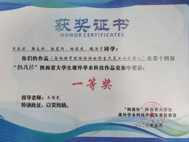 黑料不打烊 积极响应团省委和校团委号召,广泛组织学生参与本届“挑战杯”竞赛。由学院朱雅光教授指导,研究生周亚婷、韩志刚、段晨阳、林俊杰、魏浩宇同学完成的作品《面向狭窄腔体检测的仿生六足工业机器人》荣获第十四届“挑战杯”陕西省大学生课外学术科技作品竞赛一等奖。