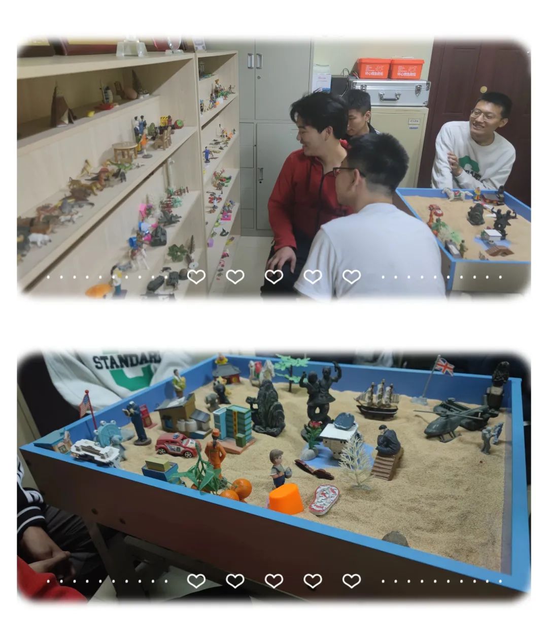 一开始团队成员大都按照自己的想法各持己见,沙具摆设也相对无序;之后有团队成员开始注意和思考其他人的想法,并配合他人摆放的基调进行放置,沙盘逐渐有条理,成员之间的配合也更多;到最后,团队向着同一个主题进行摆设。经过团队成员的合作,最终构建出了一副沙盘作品。