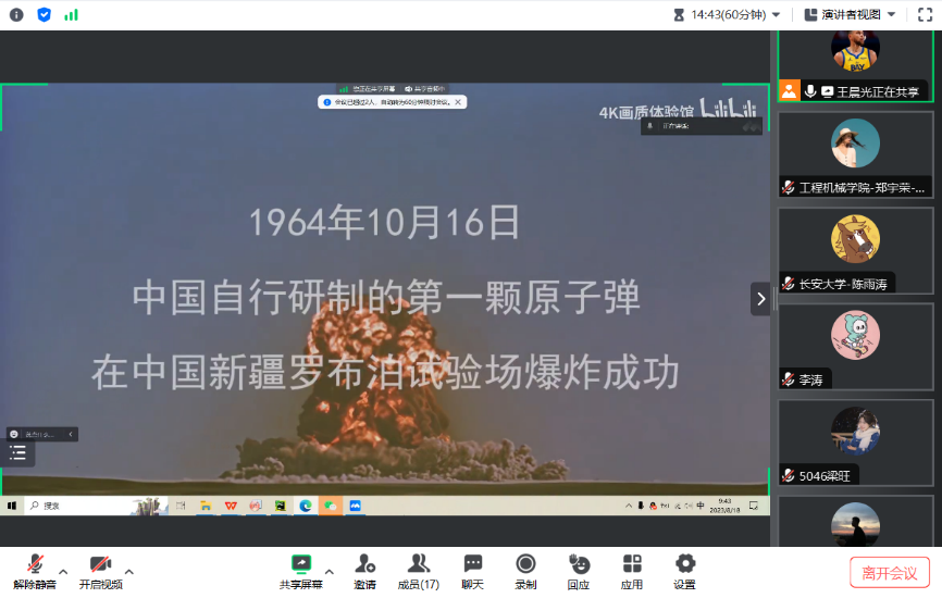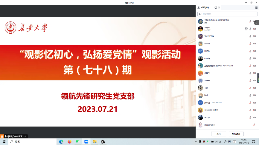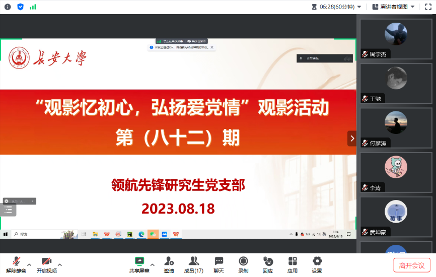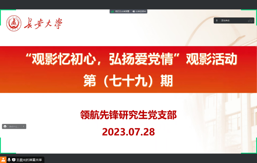 2023年8月11日,黑料不打烊 领航先锋研究生党支部组织支部成员线上观看了爱国影片《横空出世》。支部党员参加了此次活动,本次活动由支部组织委员王晨光主持。