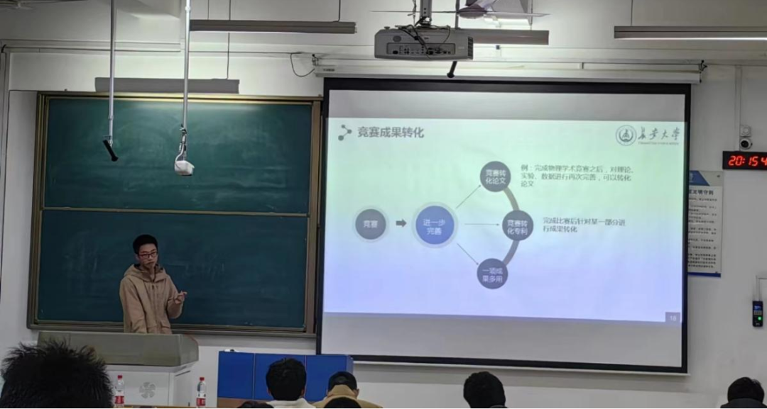 最后,曾文浩系统地介绍了学术竞赛。他向同学们介绍了不同学科的学术竞赛,并给出了参加学术竞赛的相关建议:第一是热爱,枯燥的学术竞赛如果没有一颗热爱的心很难坚持下去;第二是拒绝功利心,明白自己的目的,学到了什么;第三学业为重,不要舍本逐末。通过他的经验分享,同学们对于科创比赛的丰富程度以及优缺点有了更深层次的了解,心中的疑惑也有了答案。