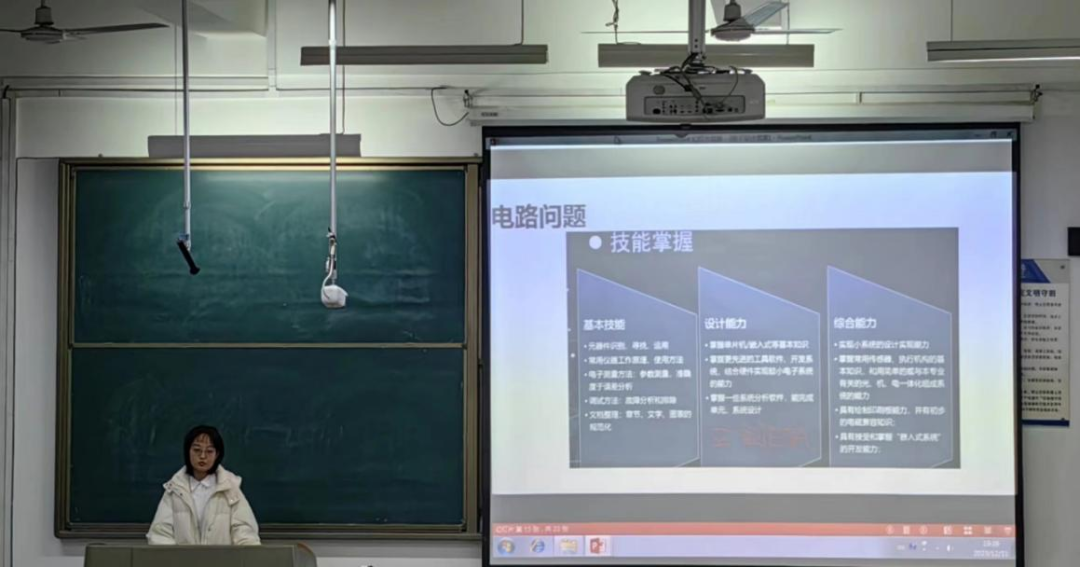 接着,马雪颖详细分享了她的经验及心得。她由自身的电赛经历展开,从备赛、组队、分工、遇到的问题、队伍训练、综合测试几个阶段向同学们展示了参加比赛要经历的过程。她指出,组队后的队员分工是关键,秉持着每个队员都能独立承担任务,避免性格冲突,避免能力真空区出现,工作区分明确的四大原则进行分工,做到万无一失。