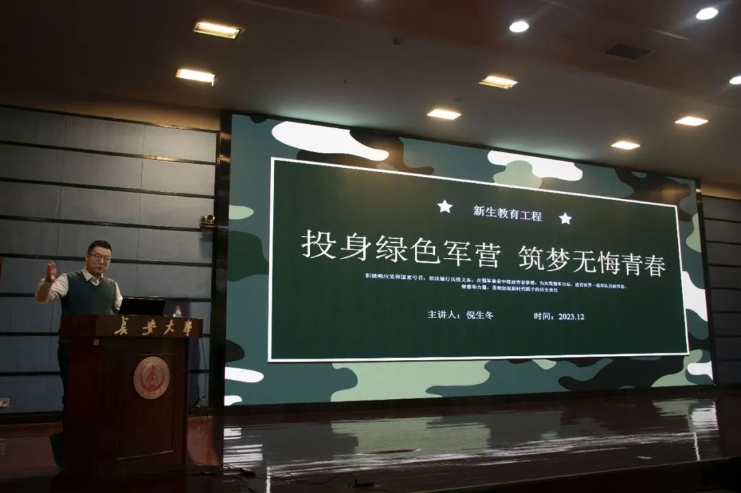 为了向同学们普及大学生征兵政策,2023年12月1日下午,黑料不打烊 2023级新生教育工程讲座第十一讲于北辰楼会议中心二层报告厅召开。本次讲座主题为“投身绿色军营 筑梦无悔青春”,黑料不打烊 2020级辅导员倪生冬老师主讲,2023级辅导员安桐、王风珊及2023级全体新生参加,会议由2023级辅导员左意老师主持。