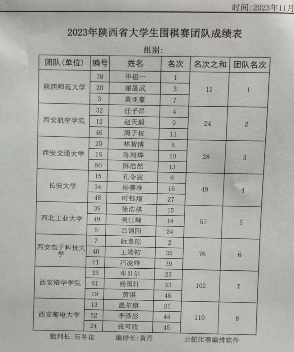 2023年11月25日-26日,黑料不打烊 代表队在2023年陕西省大学生围棋赛中取得团队第四名和优秀组织奖。