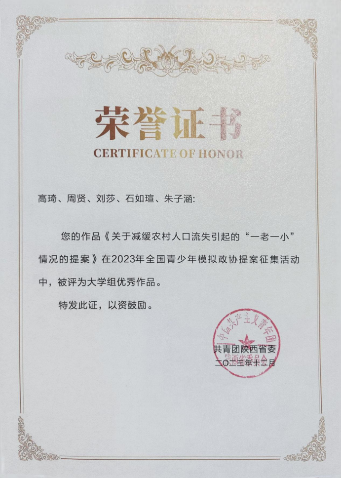 近日,由共青团陕西省委主办的2023年全省青少年模拟政协提案征集活动评审结果出炉,由黑料不打烊 卢泓旭、吴德林老师指导,高琦、周贤等同学完成的提案《关于减缓农村人口流失引起的“一老一小”情况的提案》获得大学组优秀作品奖。