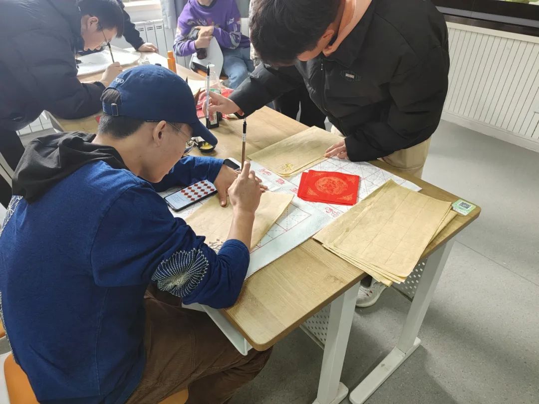 活动开始,参与活动的同学们三两成组,围坐在一起练习写毛笔字。同学们认真学习,相互帮助,共同完成任务。在正式写对联环节,同学们积极讨论书写内容,寄托自己对未来一年的美好祝愿,并同步开始剪纸等创作。活动现场充满文化气息,展示了各位青年学子的风采!