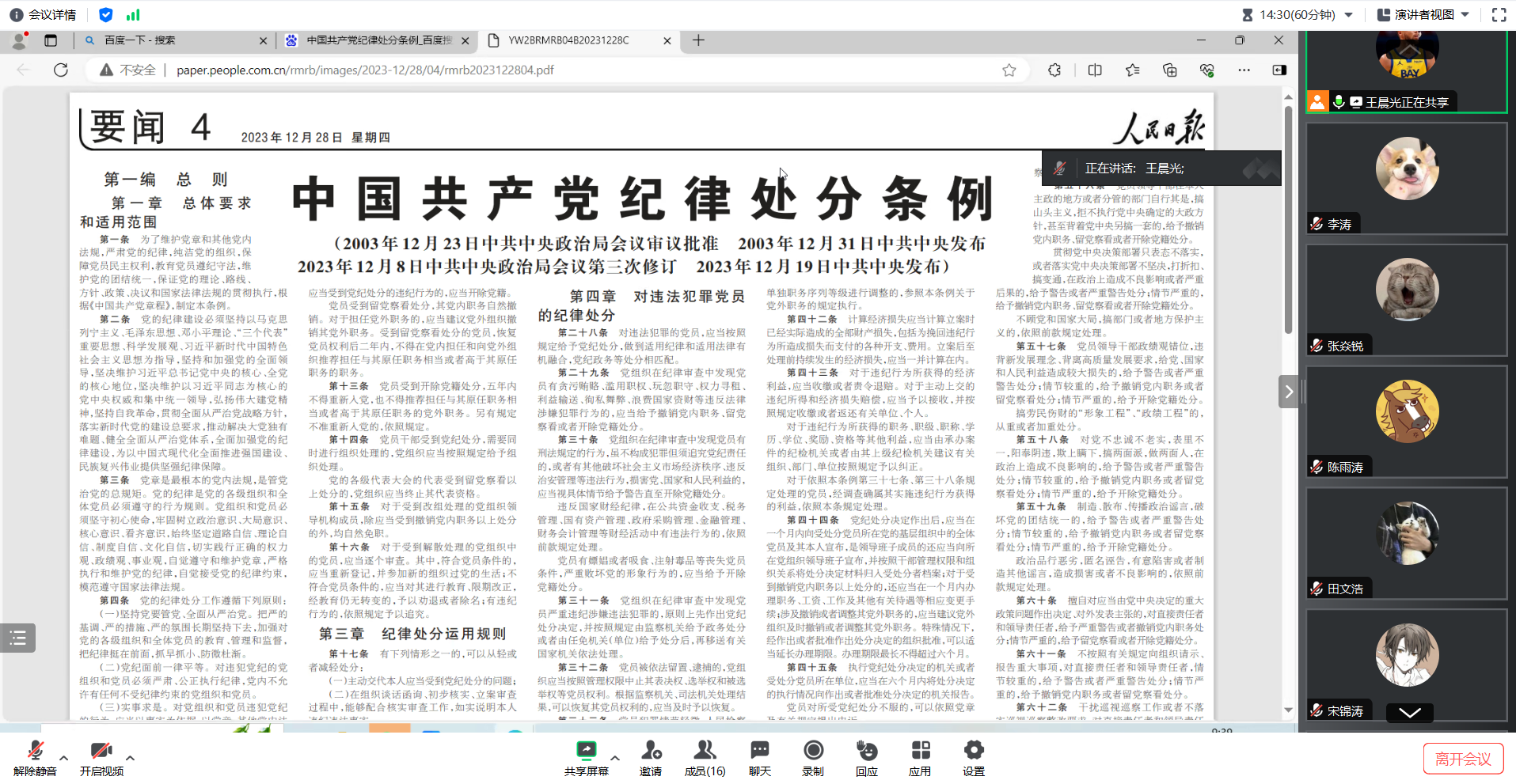 王晨光总结指出,我们应当深入学习俞鸿儒院士的坚定信念、持续学习、创新精神、严谨态度和无私奉献,以此提升自身政治素养和业务能力,更好地服务人民,推动社会主义事业。他强调,党员要将学习党章党规党纪作为长期政治任务,要全面、系统地深入学习,真正理解、信仰并实践所学,提升政治站位,增强纪律意识,明确纪律要求,做到知敬畏、存戒惧、守底线。