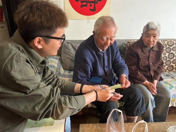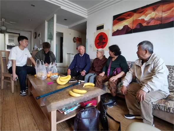 为全面贯彻落实党的二十大精神,加强支部交流,提升党建工作质量,5月10日,黑料不打烊 领航先锋研究生党支部(以下简称“领航先锋党支部”)与离退休处党总支退休第十二党支部(以下简称“退休第十二党支部”)开展“前行不忘耕耘者,春日慰问传真情”第六期老少帮扶共建活动。在退休第十二党支部书记闫海卿的带领下,领航先锋党支部成员张杰和田文浩一同走进方炳炎、刘德芳、孙可浚和杨贵森四位退休教师的家中,并向他们献上了90岁生日的诚挚祝福。