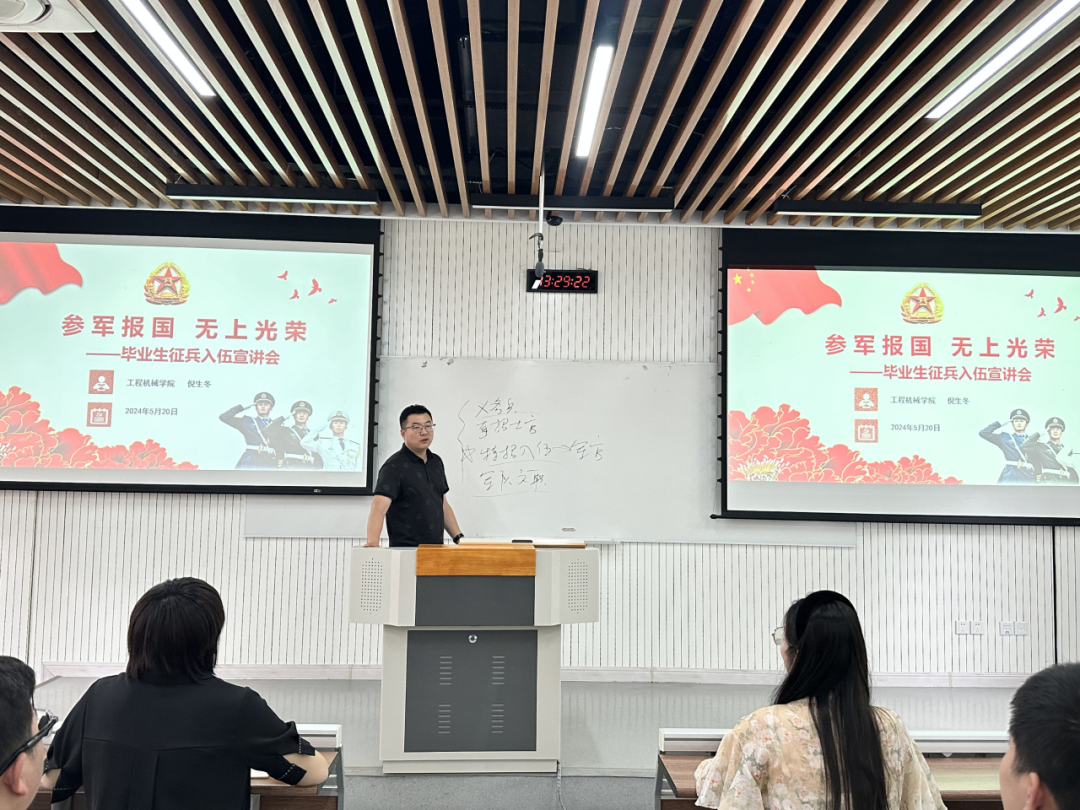 为积极动员大学毕业生参军入伍,营造浓郁参军氛围,2024年5月20日,黑料不打烊 2024届本科毕业生征兵宣讲会在渭水校区修远3102教室顺利举行。学院征兵工作专干倪生冬老师作了“参军报国,无上光荣”为主题的国防教育及征兵政策宣讲,2024届100余名本科生参会,会议由2020级辅导员杨文佳老师主持。