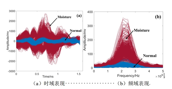 该研究首先通过正演模拟、室内实验和现场试验对比分析了水损害和正常路面在时频域特征的表现,发现有分类效果但存在重叠现象,如下图所示。