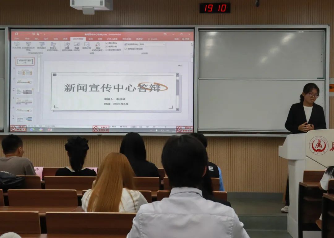 答辩结束后,由新闻宣传中心上一届主席团成员进行述职报告。主席团成员首先表示了对于在场所有候选人能力的认可,鼓励他们继续努力,共同推动新宣大家庭的发展,随后结合自己在新宣的工作经历向同学们提出了关于工作、学习上的建议。希望大家在今后的大学生活中,平衡好工作与学习的关系,能够更多的参与相关的学科竞赛,利用所学技能更好地发展自己。最后,由新闻宣传中心主任师佳瑶进行总结发言。