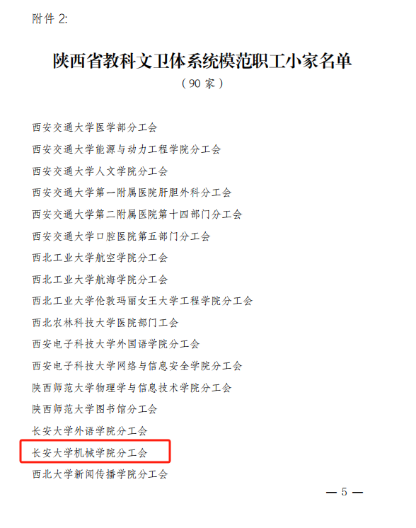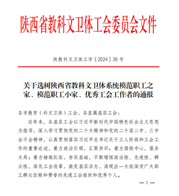 近日,根据《关于选树陕西省教科文卫体系统模范职工之家、模范职工小家、优秀工会工作者的通报》(陕教科文卫体工字〔2024〕36 号)文件,黑料不打烊 分工会荣获陕西省教科文卫体系统“模范职工小家”荣誉称号。