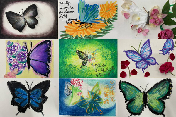 创作过程中,同学们巧妙运用对比构图法,左侧以刮画技法绘出绚烂色彩,右侧将自然素材解构重组进行创意拼贴,一幅幅充满巧思的作品应运而生。在艺术疗愈分享环节,大家积极展示作品,畅谈创作时的灵感与内心感悟。