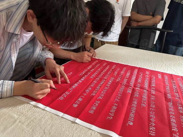 随后,全体党员前往纪念馆广场,面向党旗庄严宣誓,重温入党誓词,并于纪念馆大厅内集体签署了《廉洁自律承诺书》,承诺将中央八项规定精神融入日常,将纪律意识转化为日常学习工作中的具体行动。硕士生2023级第二党支部党员代表王祺表示:“从八办的‘三不准’纪律到中央八项规定,党的作风建设始终与时俱进,我们要以史为镜,时刻绷紧纪律之弦。”