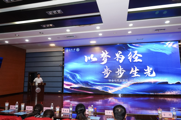 晚会现场举行的优秀毕业生颁奖仪式,分别由院长叶敏、党委书记高雁北为二类和一类优秀毕业生颁奖。优秀毕业生代表钟伟发表了《以梦为径·步步生光》主题演讲,他对师长、父母、同学的帮助表达了感谢,并祝愿母校岁岁桃李芬芳、学院续写华章,祝福2025届的毕业生们,心中常驻星河、脚下步履铿锵,奔赴繁花似锦的远方。