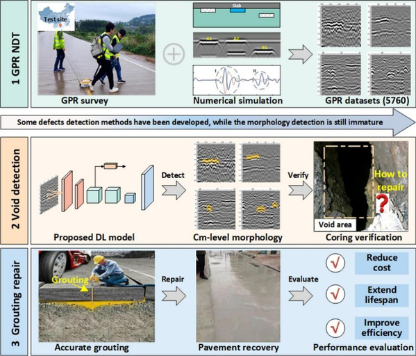 面对这一行业难题,团队成功研发出一种创新性的数据驱动框架,完美融合了探地雷达(GPR)与深度学习技术,实现了对水泥路面内部脱空从“厘米级精准识别”到“参数化精准修复”的一站式全流程智能解决方案(图1)本技术的革命性在于,仅需读取探地雷达的原始数据,即可通过团队设计的深度学习架构进行智能分析,一键自动生成脱空的精确三维“画像”——包括其形态、位置、深度、体积等关键参数,为后续的注浆修复提供了科学依据。