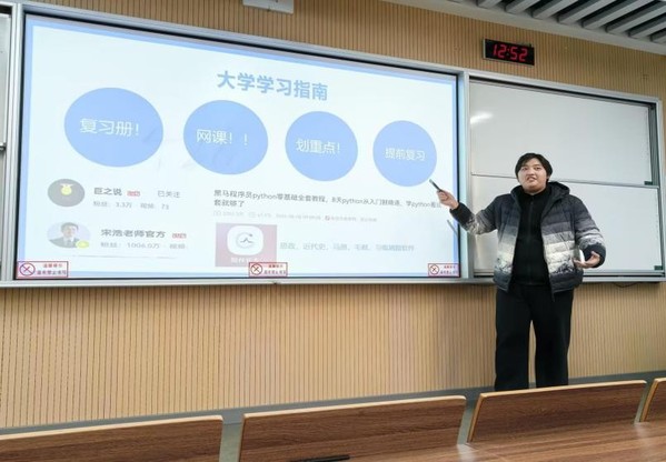 班会开场,张弛老师表示,今天的分享是“从校园实战里抠出来的干货”,帮助大家提前理清大学成长的关键方向。随后,林雨轩同学分四大板块展开介绍。针对机械专业课程的“重逻辑、多公式”特点,推荐“专业课复习册+B站博主”的组合,强调“课前标记疑问点、课中抓重点、考前复盘”的策略。在竞赛方面,他结合自身参赛经历,拆解了机械类竞赛的参与逻辑,将竞赛分为入门、进阶、冲刺三个阶段,并对备赛细节进行了讲解。